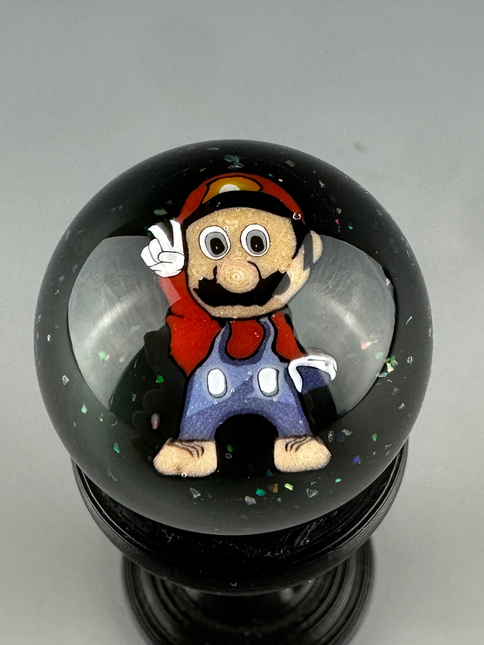 Black crushed opal with a peace out M Millie on the front, and a Micro signature Millie on the back.